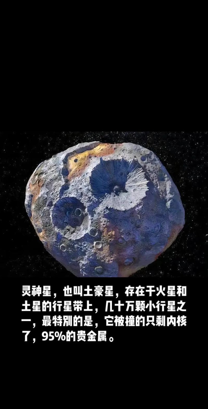 光谱分析显示,一颗名为“灵神星”的小行星,其金属含量竟高达82.5%。科学家估算,一颗直径仅1公里的小行星,就可能含有2亿吨铁、3000万吨高品质镍、150万吨战略钴以及7500吨铂族金属——单是铂的价值就可能高达1500亿美元-。